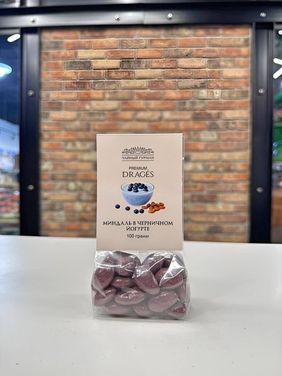 Миндаль цельный обжаренный, сахар, масло какао, черника натуральная сублимированная, сыворотка сухая молочная, молоко сухое цельное, эквивалент масла какао (масло пальмы, масло ши, натуральный антиоксидант (смесь токоферолов), лимонная кислота), йогуртовая культура, эмульгатор соевый лецитин, натуральный ароматизатор «экстракт ванили», эмульгатор Е476, глазирователь Капол.