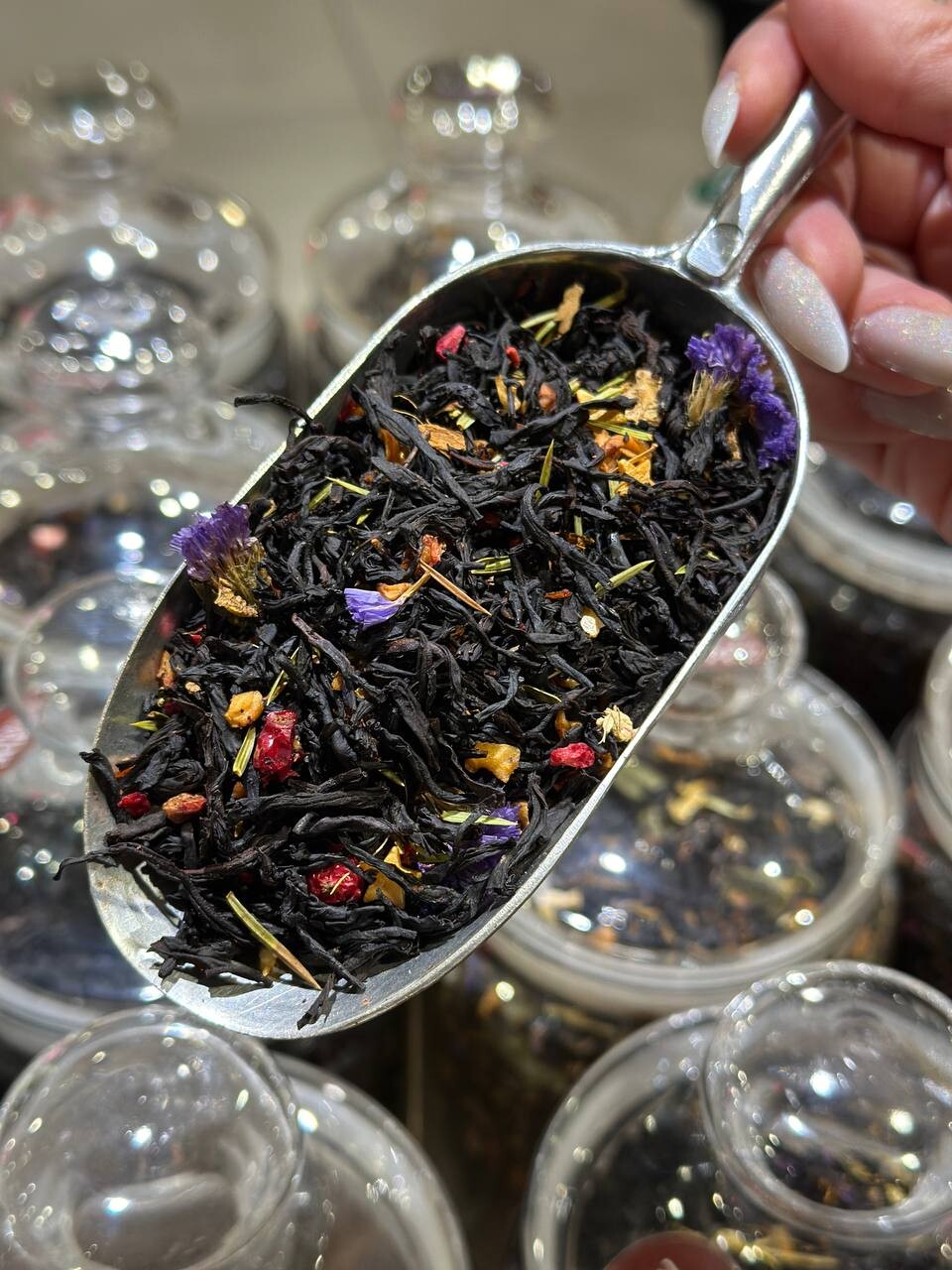 Состав: черный чай, иголки можжевельника, корица, яблоко, имбирь, красная смородина, сахарные звездочки, малина, имбирь, незабудка.